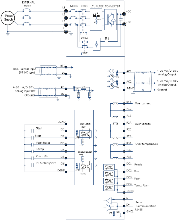 Display Indications | Display and Keypad module | Digital Operation Panel 128 x 64 Graphical LCD with white back light LED, 8-Key keypad, 3-Status indicating LED for Run, Stop and Fault; Real Time Clock. | |||
