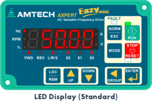 | Display | LED Display & Keypad | 5-digit 7-segment LED display with unit indicators, motor direction, status LEDs (Run, Stop, Fault) and 9-key keypad |
