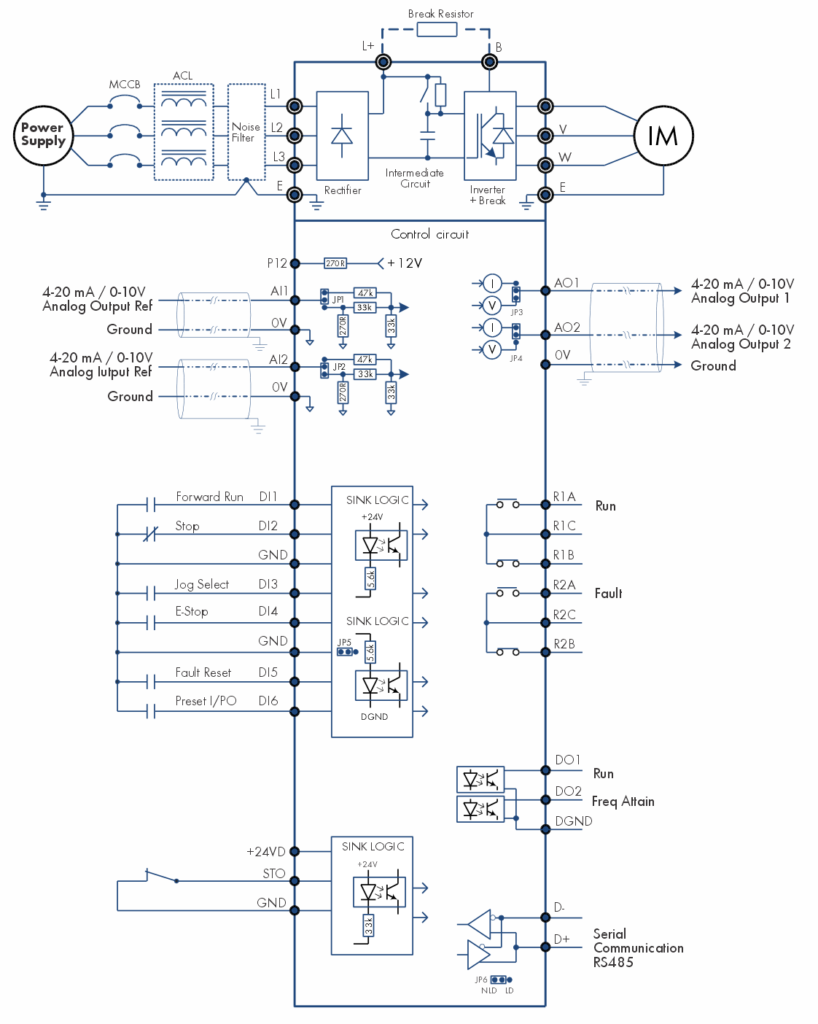 Keypad (Digital Operation Panel) Analog Input: 2 kΩ Potentiometer / Programmable Analog Inputs Digital Input: Frequency Increase/Decrease, Preset Speeds Serial Communication: RS-485 Built-in PLC Analog Outputs |