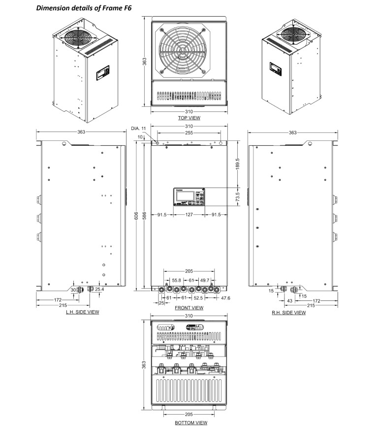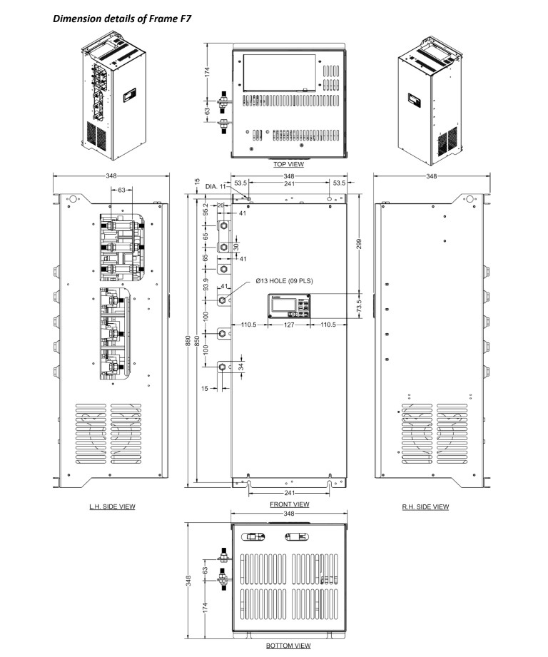 Display | Display and Keypad unit | Digital Operation Panel 128x64 Graphical LCD with white back light LED, 8-Key Keypad, 3-Status indicating LED for Run, Stop, Fault | Real Time Clock Simultaneous display of 8 selectable monitor parameters Two graph screens with selectable graph signal and resolution Load Analyzer screens | Auto rotation of screens with settable time interval |